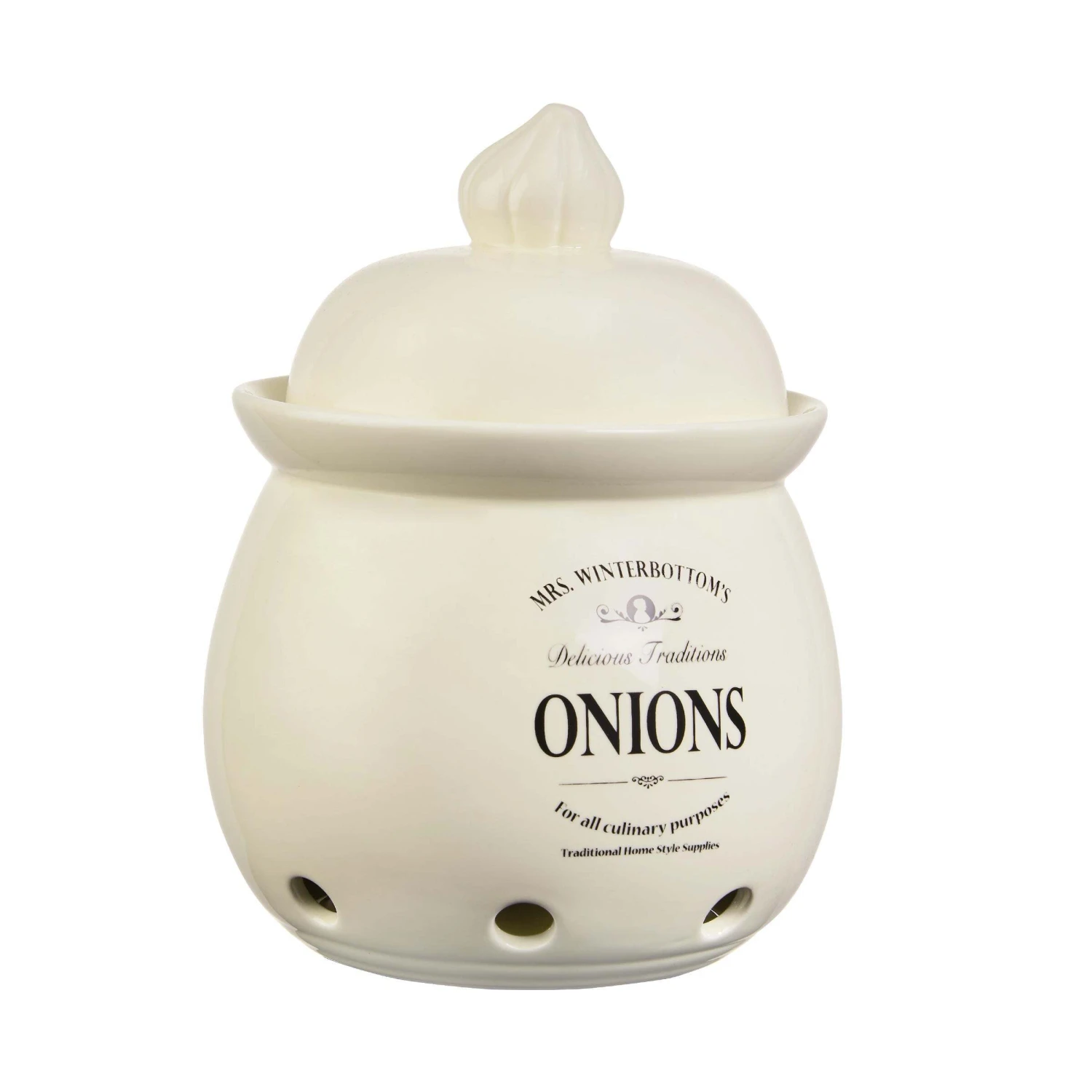 Mit diesem Zwiebeltopf im englischen Vintage Design bringen Sie Ordnung mit System in ihre Küche! Geräumig und stilvoll bietet der runde Behälter genügend Platz für die Zwiebel-Lagerung und das Aufbewahren anderer Vorräte. Die Lebensmittel bleiben im Vorratsbehälter länger haltbar, denn der Topf mit Deckel bietet Schutz vor Dreck, lagert alles ordentlich und trocken und passt zudem mit seiner Retro Form perfekt in typische Küchen im modernen oder Landhausstil.